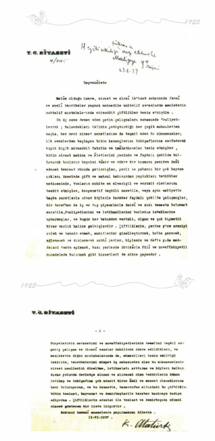 Bünyelerinin metanetini ve muvaffakiyetlerinin temelini teşkil eden geniş çalışma ve ticari esaslar dâhilinde idare edildikleri ve memleketin diğer mıntıkalarında da, mamülleri tesis edildiği takdirde, tecrübelerini müspet iş sahasından alan bu müesseselerin, ziraat usullerini düzeltme, istihaslatı artırma ve köyleri kalkındırma yolunda devletçe alınan ve alınacak olan tedbirlerin hükmü intihap ve inkişafına çok müsait birer amil ve mesnet olacaklarına kani bulunuyorum. Ve bu kanaatle, tasarrufum altındaki bu çiftlikleri bütün tesisat, hayvanat, demirbaşlarıyla beraber hazineye hediye ediyorum.